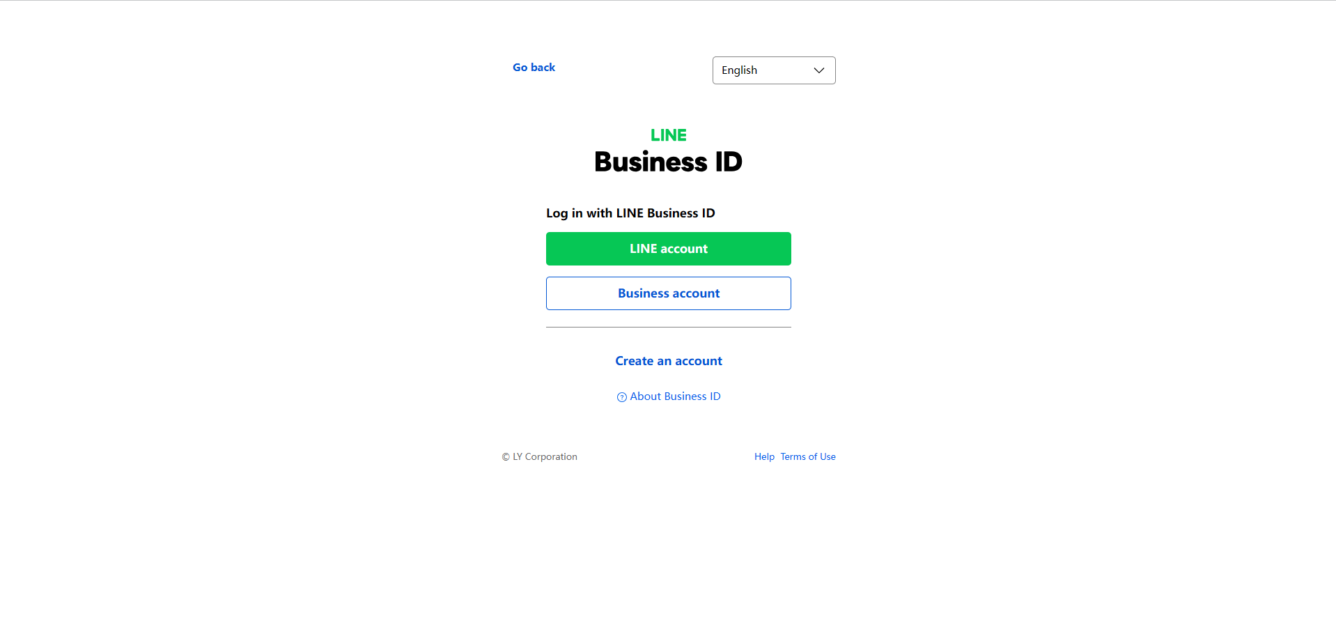 选择登录方式(【Log in with LINE account】或【Log in with business account】)并完成登录。如无账号,请先点击 【Create an account】 完成注册。