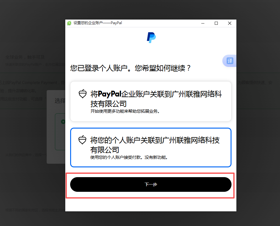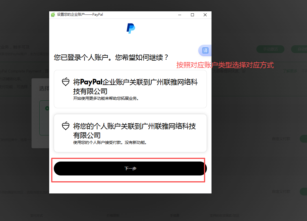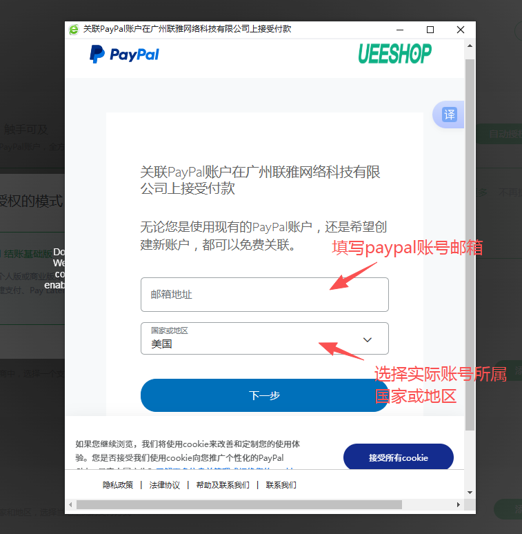 3.填写paypal账号,选择国家,点击下一步完成授权