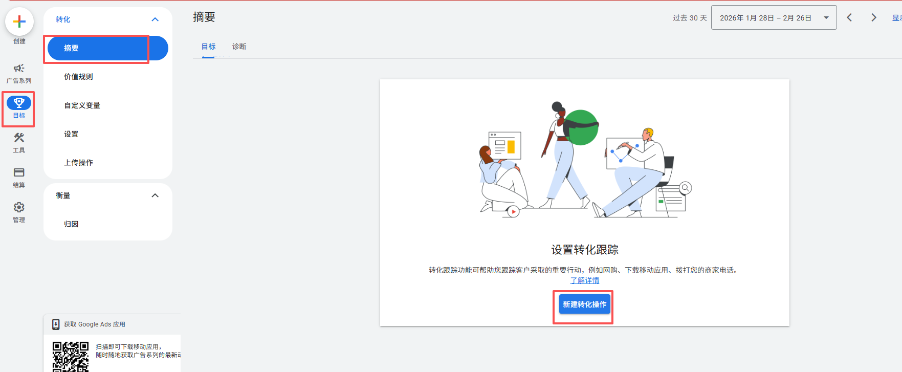 (2)点击左侧工具栏,选择目标,摘要,点击新建转化操作