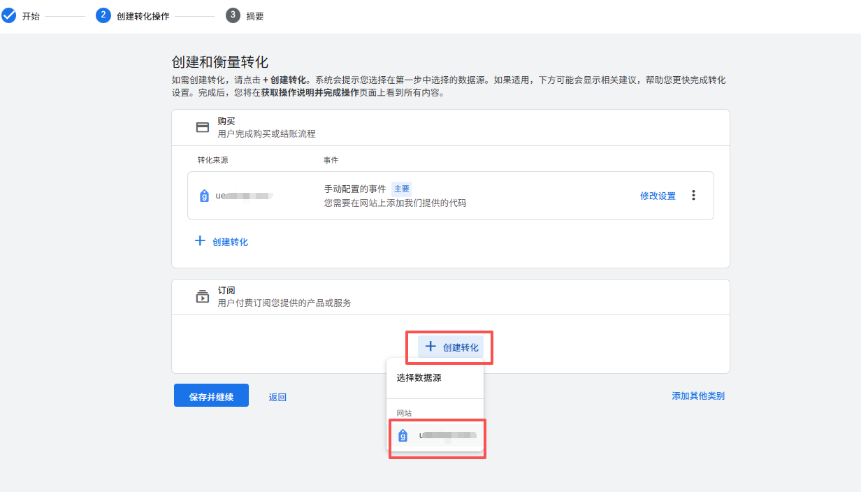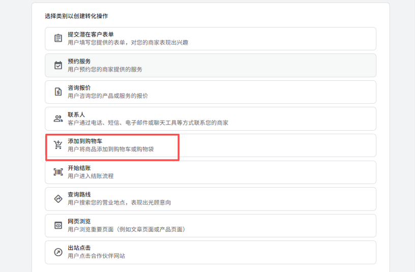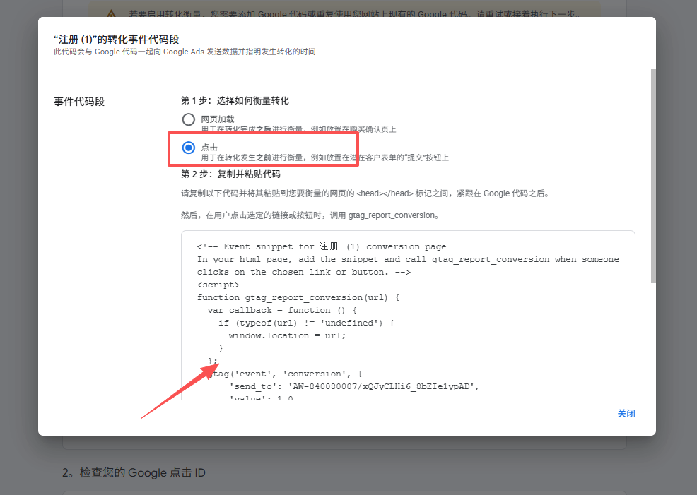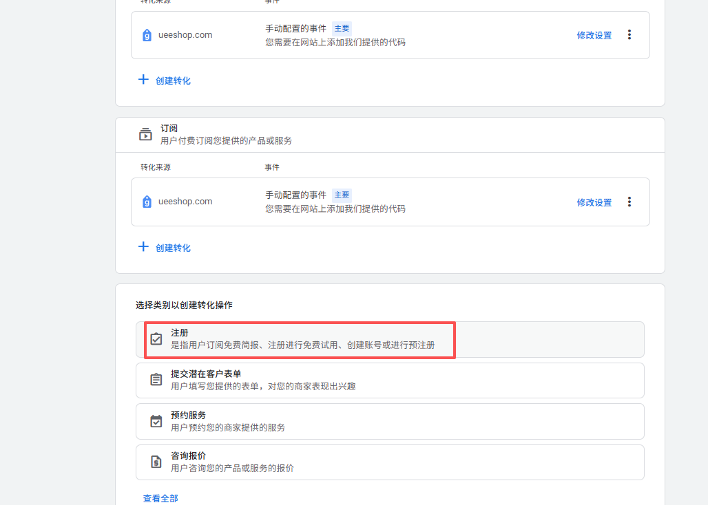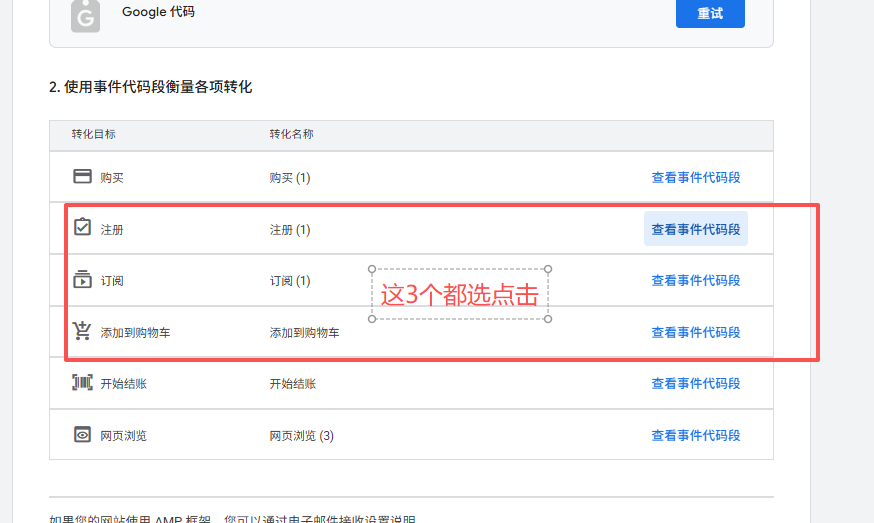 注意:红框内的3个转化目标(注册、订阅、添加购物车),点击查看时间代码后,选择的类型是“点击”类型,再进行代码的复制