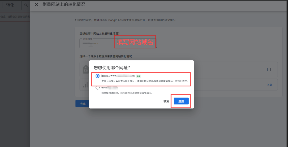 (4)填写网站域名,选择推荐的模式,点击“应用”