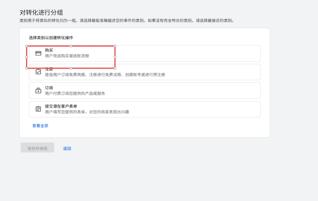 (39)选择需要添加的目标类型,如上述步骤复制的是网页浏览的事件代码,就选择“购买”