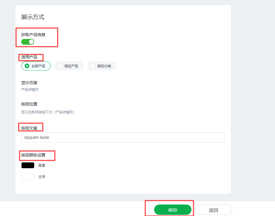 勾选获取产品信息,选择询盘按钮显示的产品范围和具体的按钮文案,点击保存