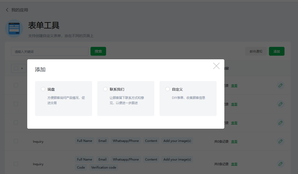 (4)询盘类型:在产品详情页内添加表单,有现成提交参数,也支持自定义