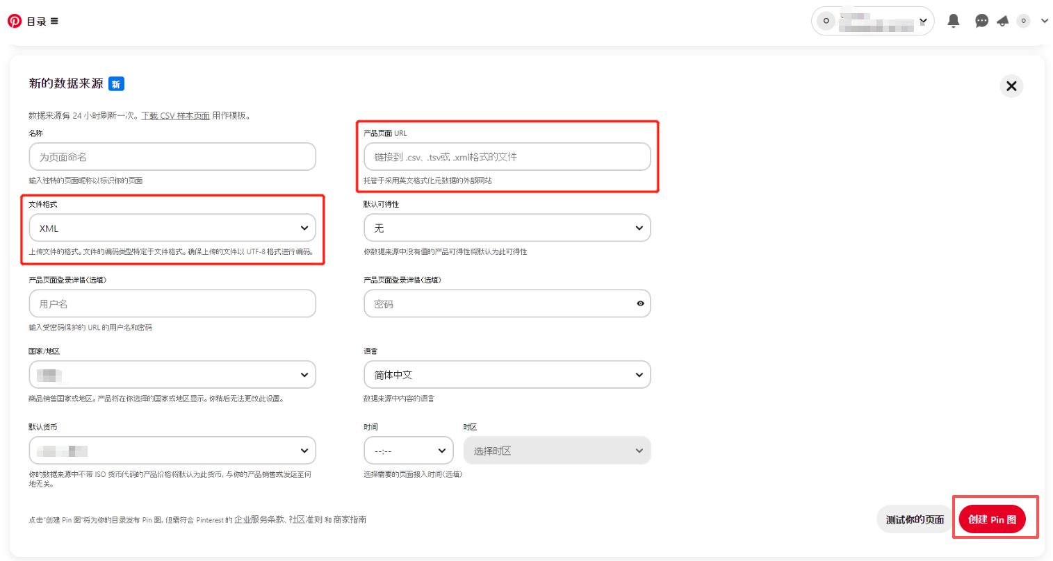 (5) 回到pinterest,填写 Feed 上传规则。将文件格式调整为“XML”,从复制的 XML 链接,填入产品页面URL