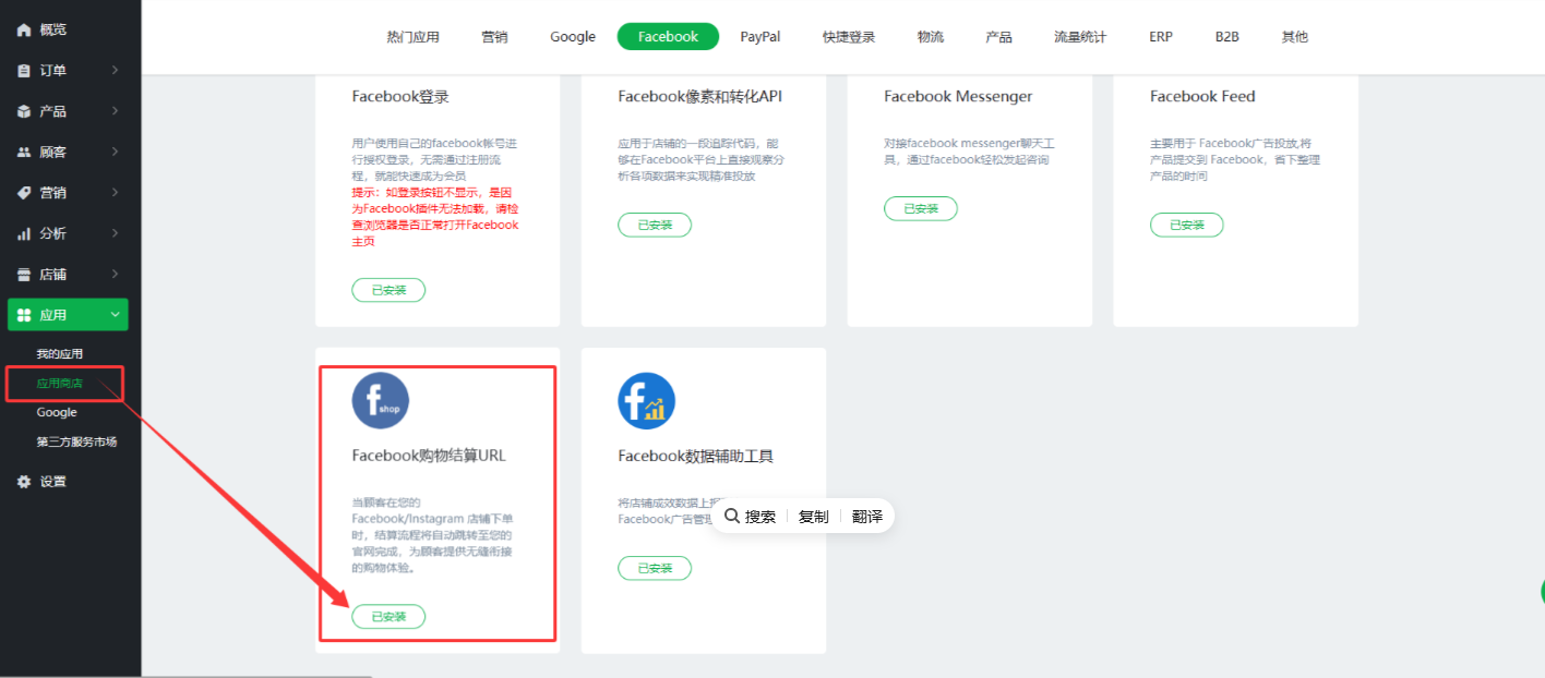 (3)登录到网站后台,左侧工具栏,点击应用--应用商店,找到facebook购物结算URL