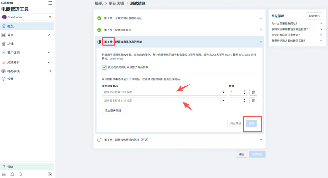 (7)进入第四步,如独立站有创建可用优惠券可设置到优惠券码输入框中,跳转网站结算时会自动带入,如果没有,可以点击继续,并且保存地址