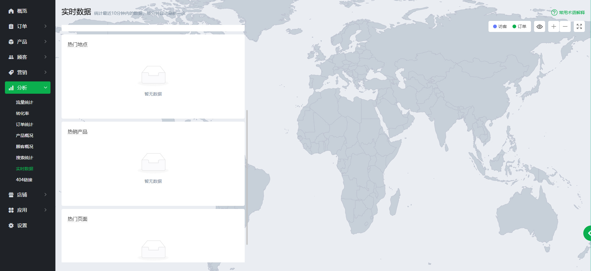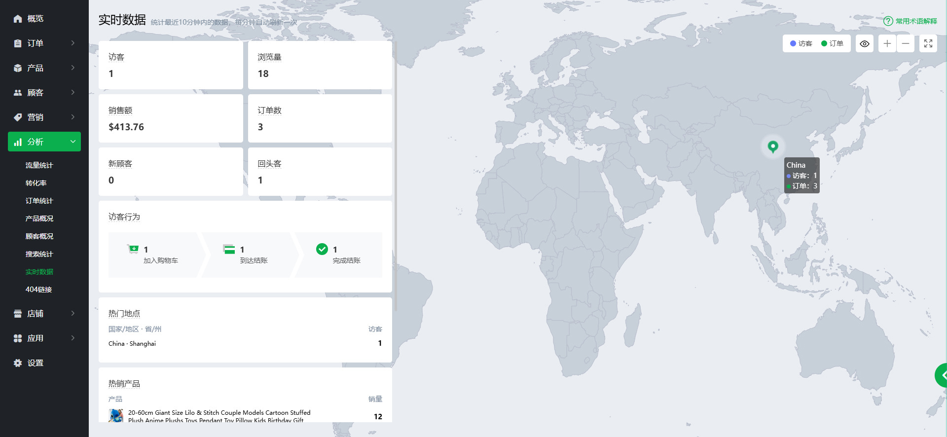 【3】强化全球销售监测:世界地图展示与访客订单来源,可帮助卖家快速判断目标市场表现,为投放和选品提供依据。