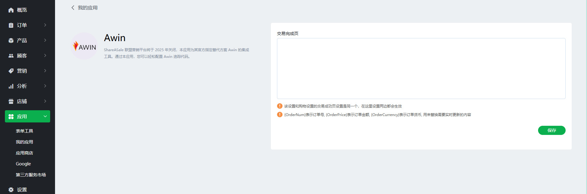 (1)在后台应用商店的“营销”分类中新增名为“Awin”的应用。