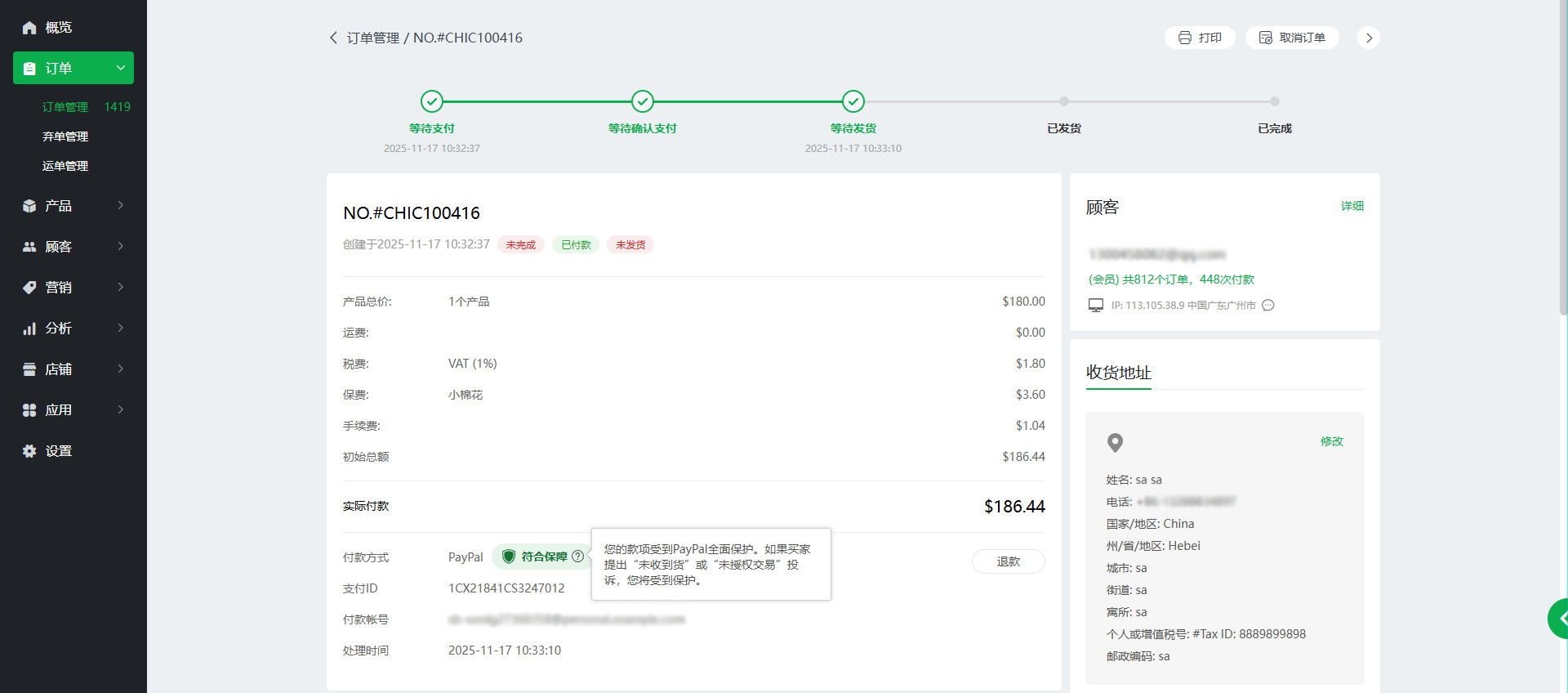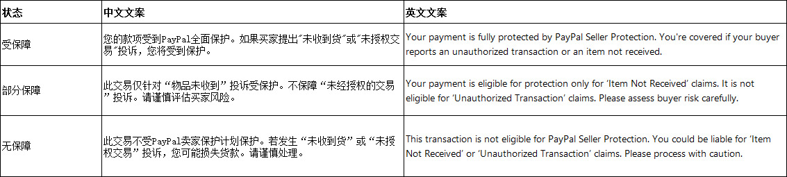 功能概述:订单详情页新增PayPal卖家保护标志,当订单使用PayPal支付,并处于已付款或待处理状态时,系统会在“支付方式:PayPal”右侧清晰展示保障等级。