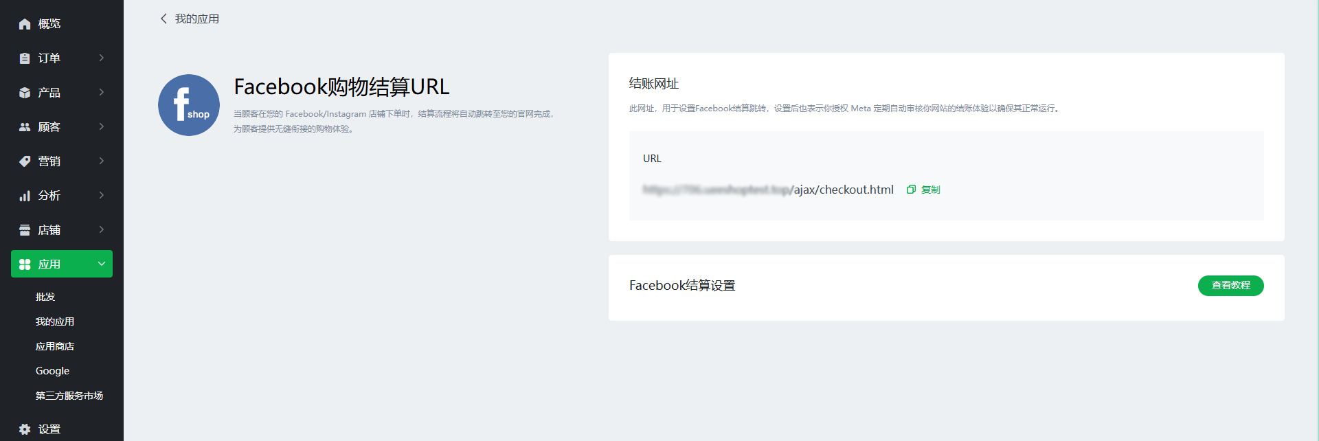 (1)在后台应用商店的 Facebook应用分类中,新增 【Facebook购物结算URL】应用。