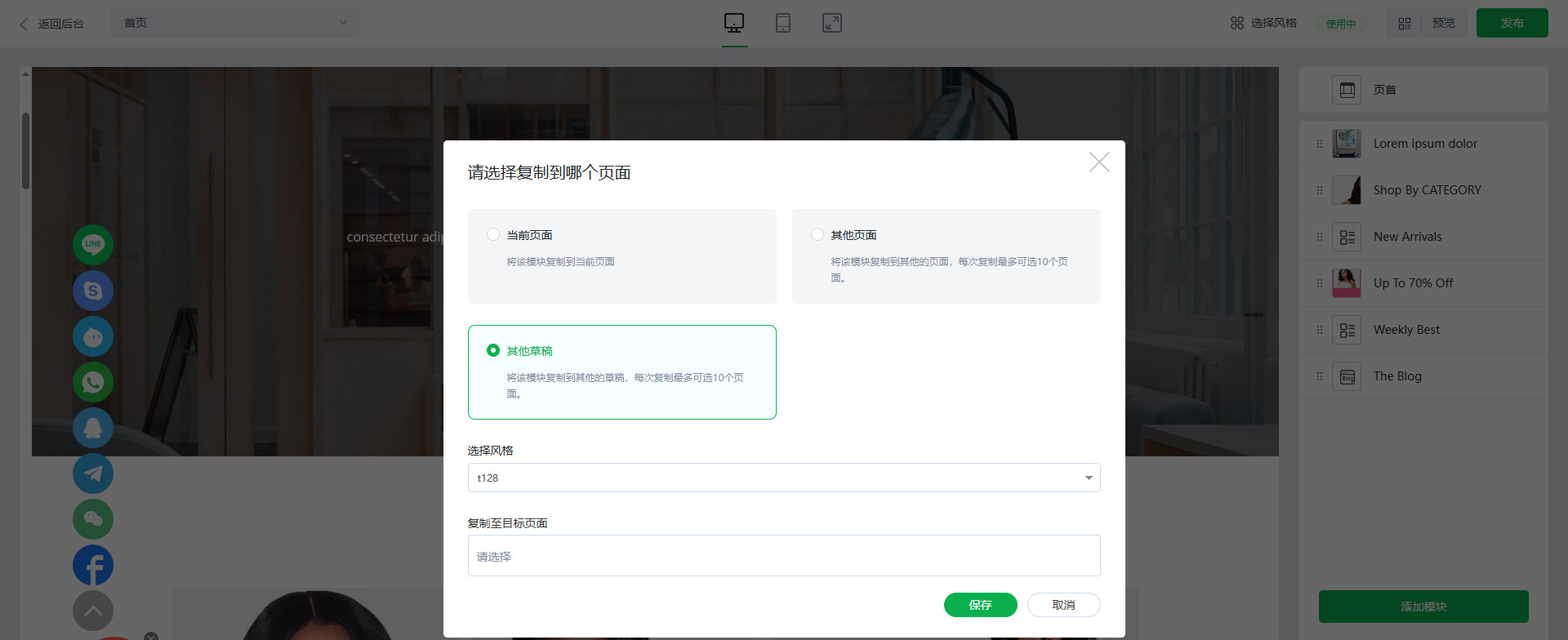 (1)在后台网站装修页面,点击任意模块的【复制】按钮,系统弹出“请选择复制到哪个页面”弹窗。
