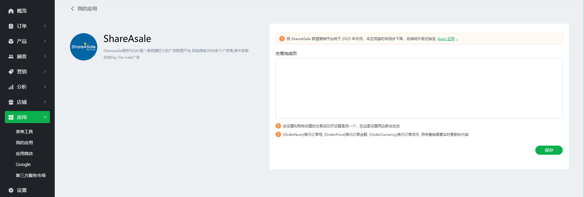 (2)在后台ShareASale 应用增加提示:因 ShareASale 联盟营销平台将于 2025 年关闭,本应用届时将同步下架,后续将升级切换至Awin 应用。