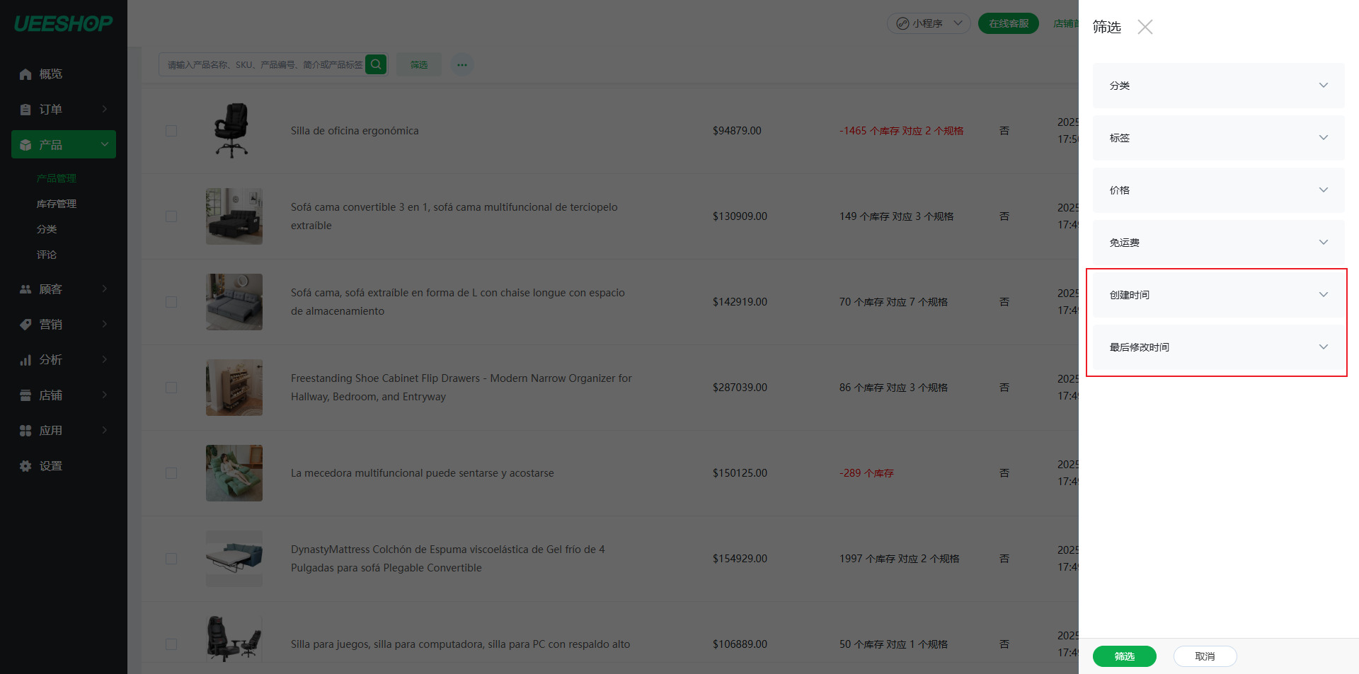 功能概述:产品列表新增“按时间筛选”能力,支持根据“创建时间”和“最后修改时间”查看产品。