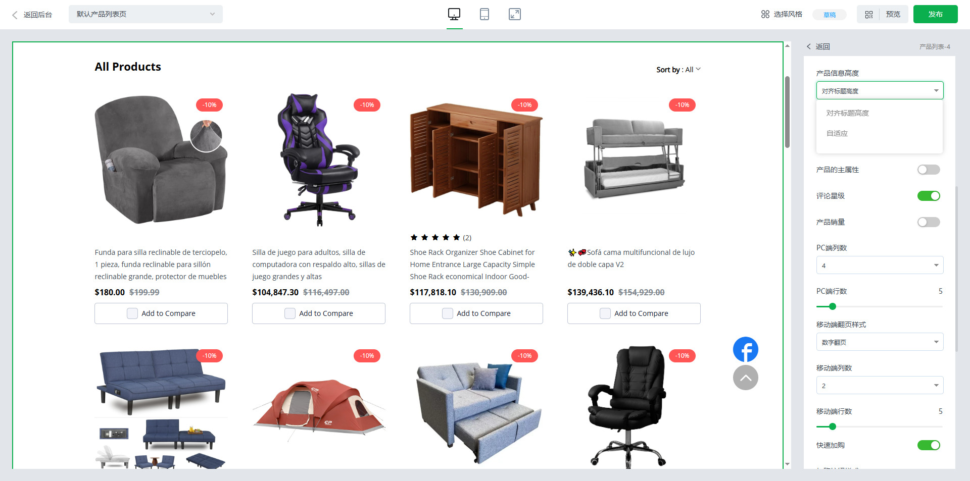在后台店铺装修的产品列表页中,为产品列表插件新增“产品信息高度”配置选项。