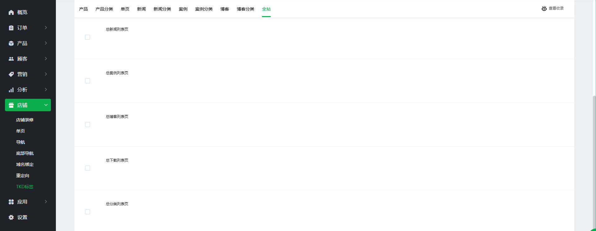 功能概述:后台TKD标签设置中,新增“下载总页面”与“产品分类总页”两类页面的独立配置入口。
