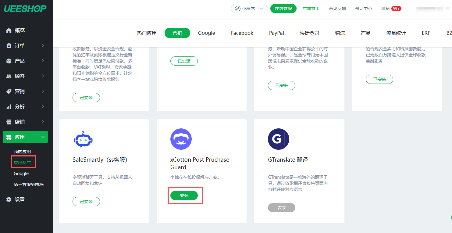 1.登录网站后台,左侧工具栏进入应用--应用商店,找到xCotton Post Pruchase Guard,点击“安装”