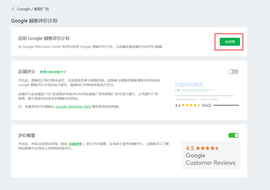 2.进行启用 Google 顾客评价计划,点击启用跳转,Google Merchant Center进行操作