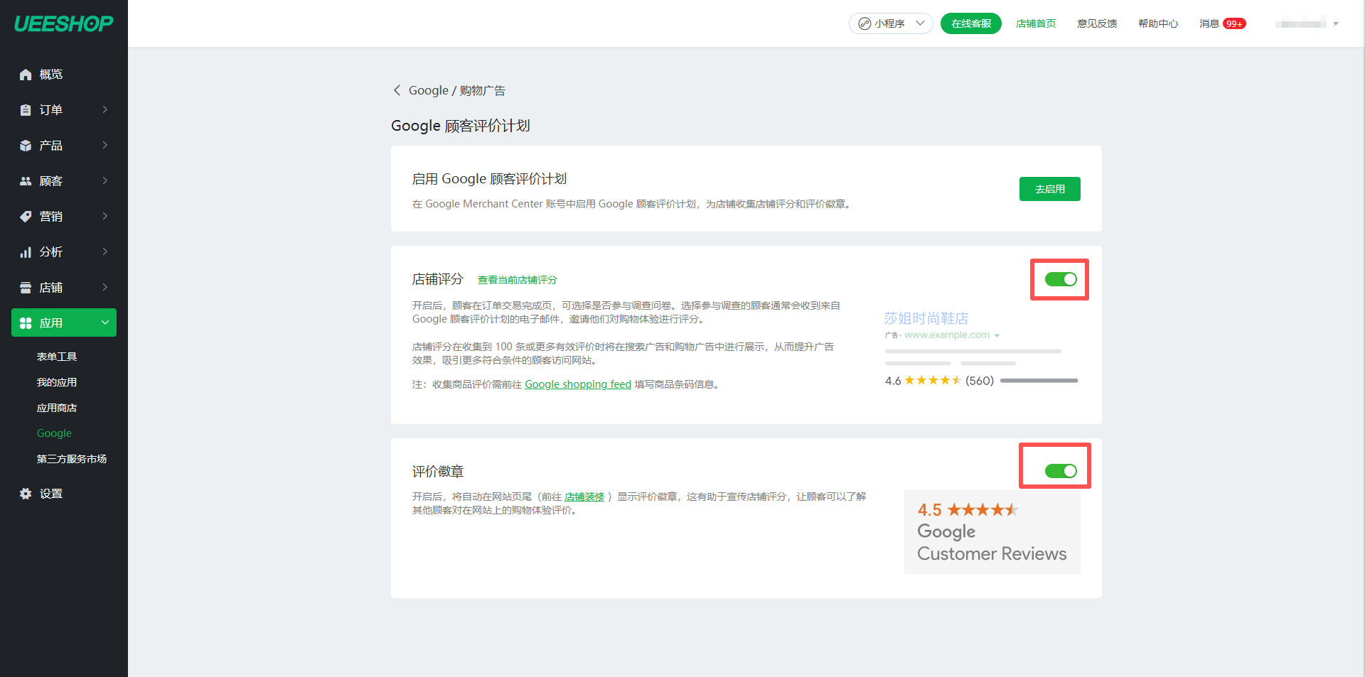 4.返回Ueeshop店铺后台,开启店铺评分和评价徽章