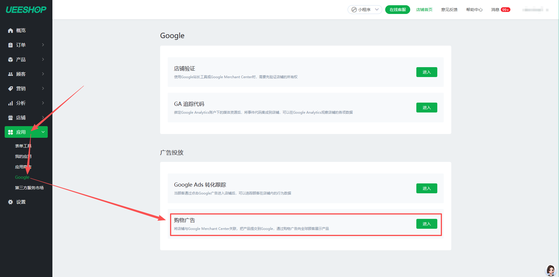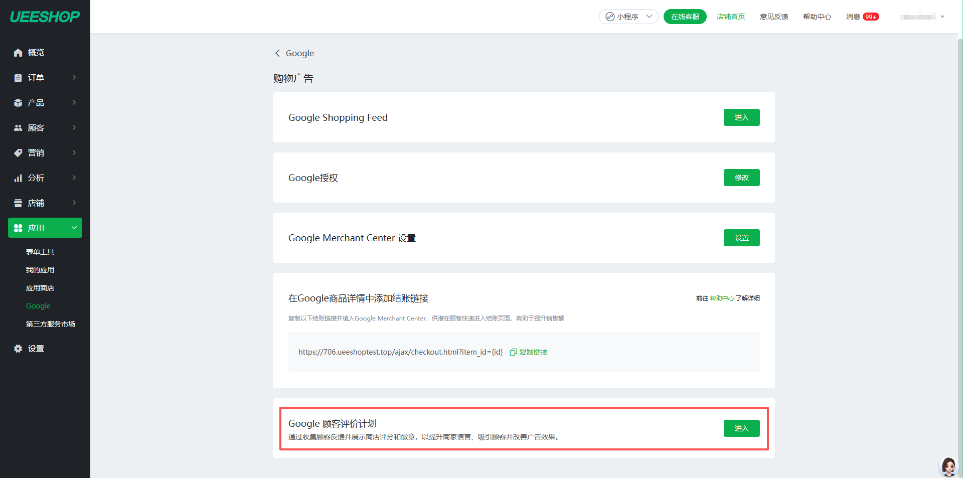 1.进入ueeshop店铺管理后台,店铺后台>应用>Google>广告投放>购物广告>Google 顾客评价计划